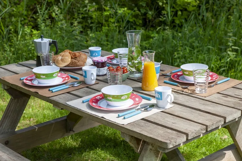 Zoek je nog een goede serviesset voor jouw kampeervakanties? Deze uitgebreide Bo-Camp Happy Camp 12-delige serviesset is geschikt voor 4 personen. De set heeft een opvallend en vrolijk design en bestaat uit 4 rode borden, 4 groene kommen en 4 blauwe mokken. Ideaal om een lekker ontbijtje met koffie te serveren!