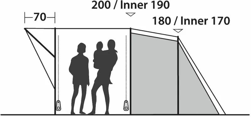 Deze tent heeft een tunnelvorm waarbij de boogstokken parallel aan elkaar lopen. Hierdoor biedt de tent relatief veel ruimte. Met een stahoogte van 190 cm kun je prima staan en jezelf binnen makkelijk omkleden. Tot slot is de tent voorzien van een voordeur én zijdeur, heel handig!