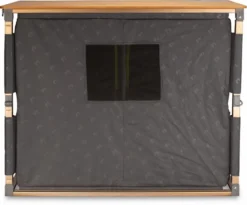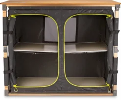 Wil je tijdens je kampeervakantie veel opbergruimte hebben en lekkere kamperen maaltijden bereiden? Dan is de Zempire Eco Fold Twin V2 opvouwbare campingkast misschien wel iets voor jou! De opvouwbare campingkast heeft een natuurlijk weer- en hittebestendig bamboe tafelblad met een roestvrij aluminium frame, wat maakt dat ‘ie 12,1 kg weegt. De opvouwbare campingkast is 100 x 49 x 82 cm groot waardoor je in deze kast lekker veel spullen op kunt bergen. Door de micro-instelbare voetjes staat deze campingkast zelfs op oneffen oppervlakken recht! Handig!